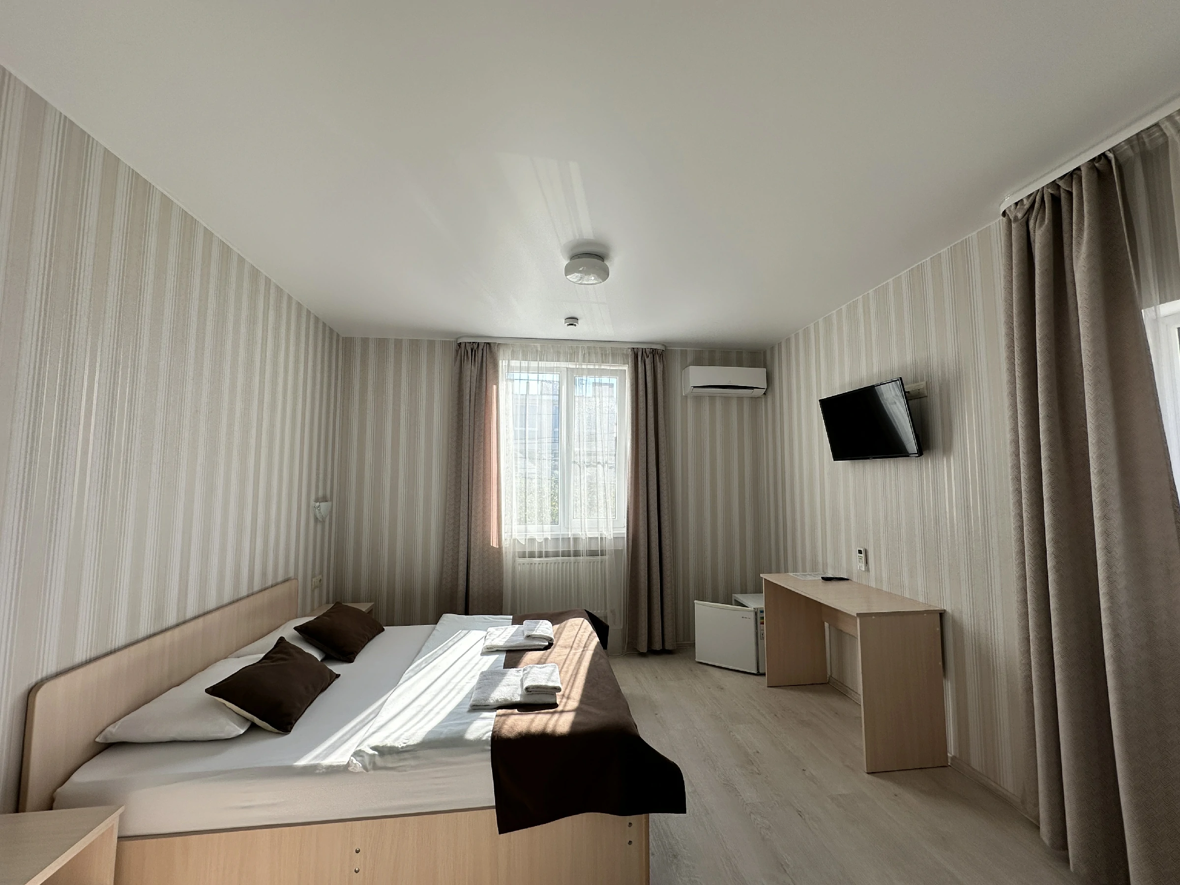 Все номера оформлены в современном стиле и уютно меблированы, оснащены сплит-системой, мини холодильником, шкафом, телевизором с плоским экраном.