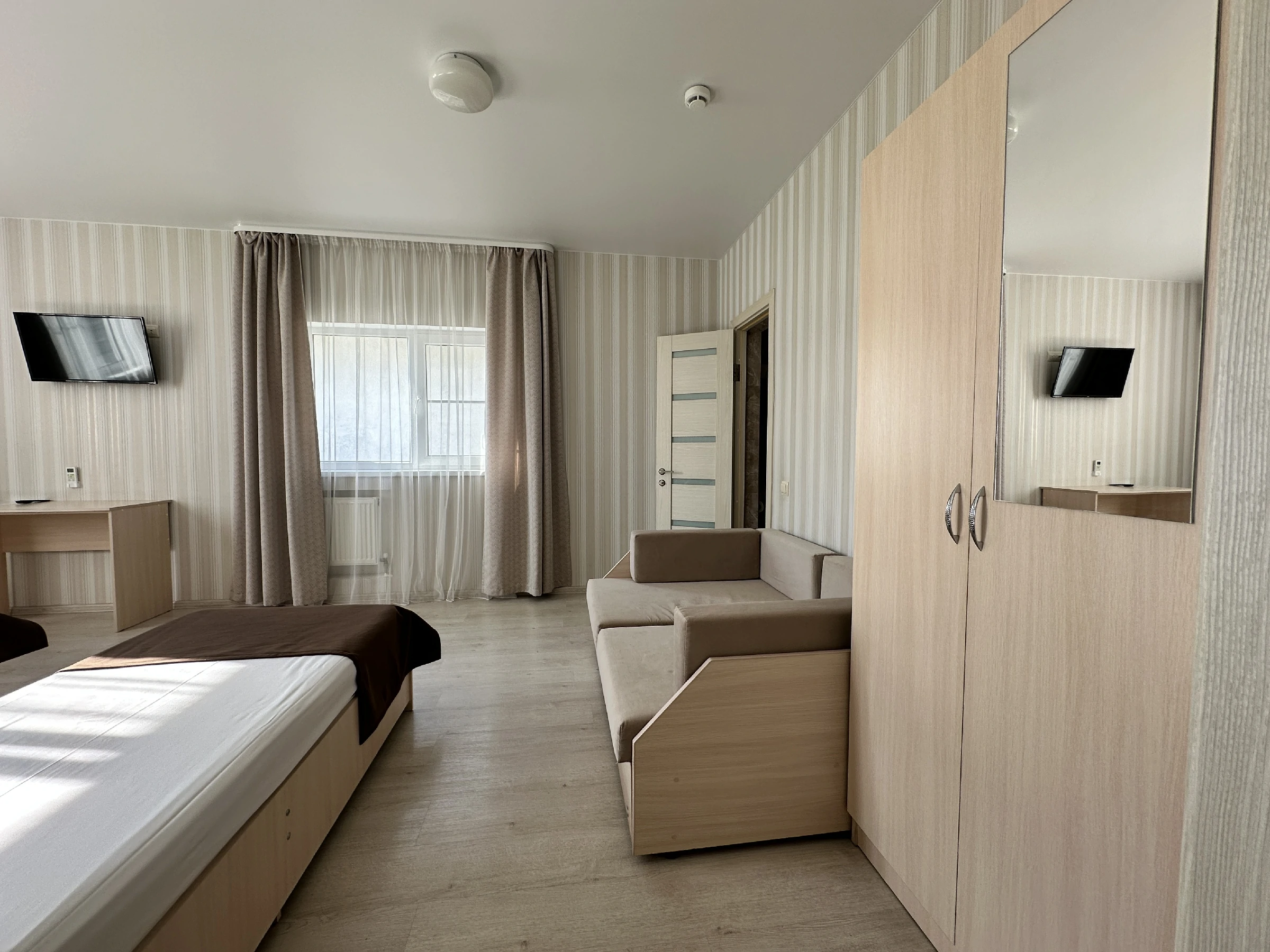 В номере одна двуспальная кровать, одна односпальная кровать и два кресла-кровати